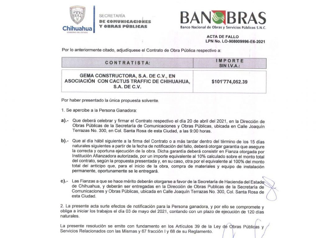 Las compañías que resultaron beneficiadas son Gema Constructora SA de CV, propiedad del exdirector de Obras Públicas Municipal, en asociación con Cactus Traffic de Chihuahua SA de CV.