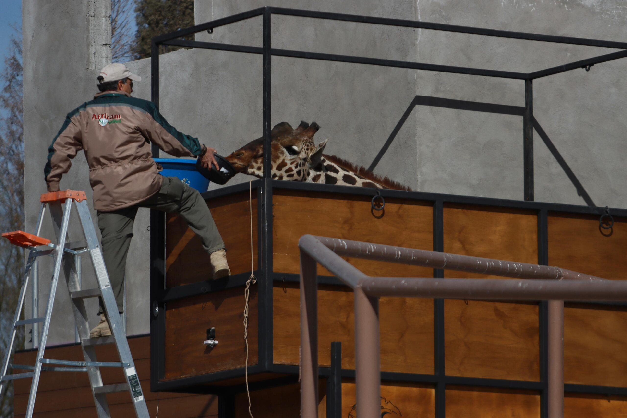 Mide seis metros de altura y está equipada para garantizar la estabilidad de la caja durante el trayecto. El equipo del zoológico se encuentra trabajando en el sitio, mientras Benito se acostumbra y sube por si sola a la caja.