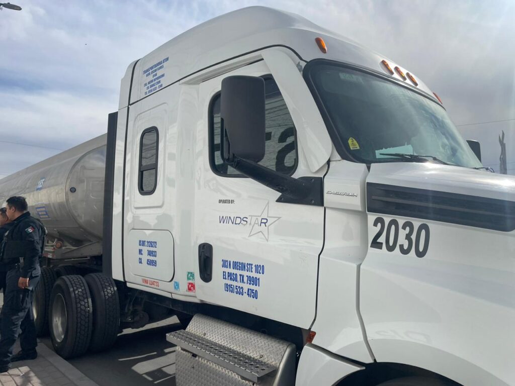 Según la información recabada por Juárez Digital en el lugar de los hechos, se constató que la pipa asegurada tiene matrículas mexicanas 89-ER-3M y, además, presenta matrícula de Texas R45 6308.