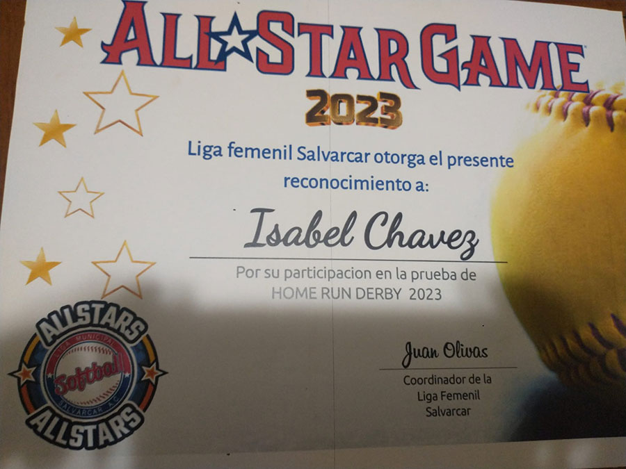 Comenzamos jugando beisbol modificado hace como 10 años en el parque Niños Héroes, hoy en día jugamos cada domingos en la Liga Salvarcar, en este deporte he sido seleccionada para jugar juegos de estrellas, bateo, y conseguí un trofeo de primer lugar como pitcher en la convocatoria pasada.