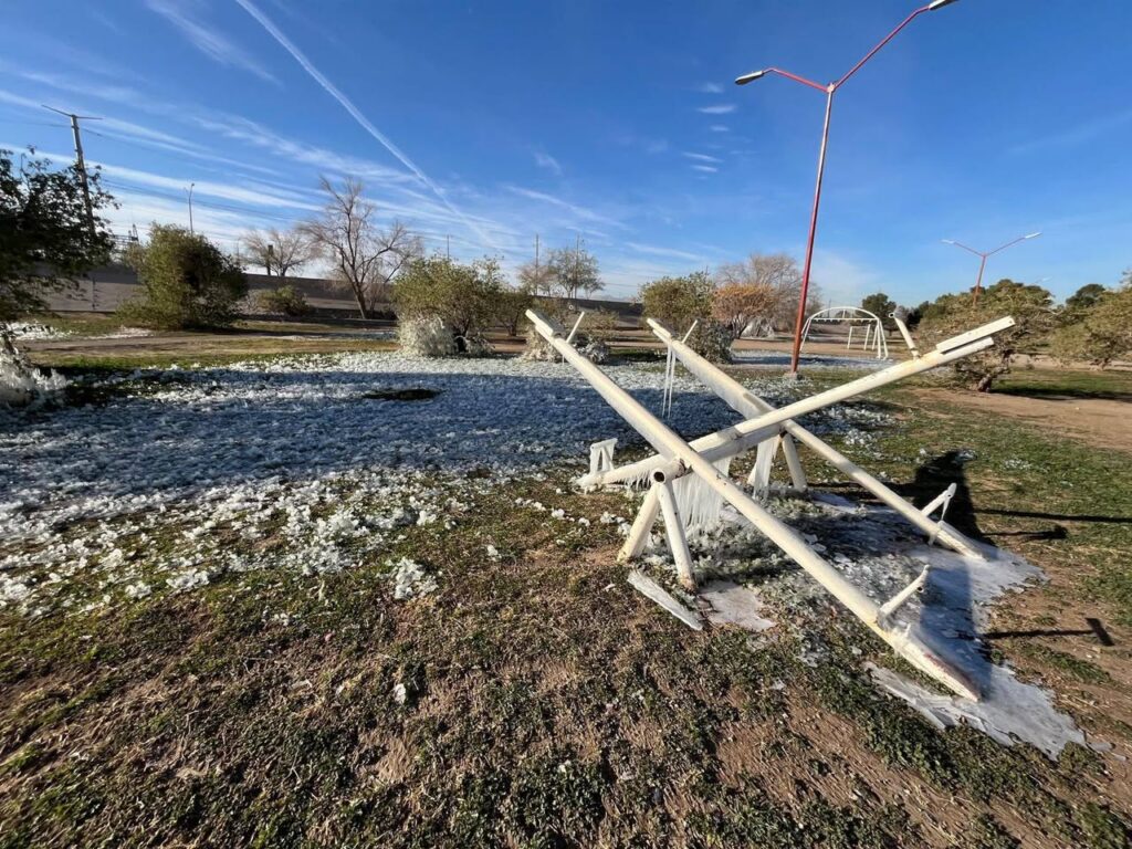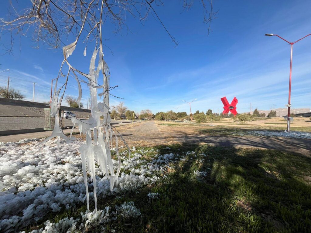 En un recorrido por las inmediaciones de la Plaza de la Mexicanidad, se observaron carámbalos, conocidas comúnmente como estalactitas de hielo, formados en las ramas de los árboles y en los juegos infantiles, como los subibajas, donde el hielo cuelga casi hasta el suelo.