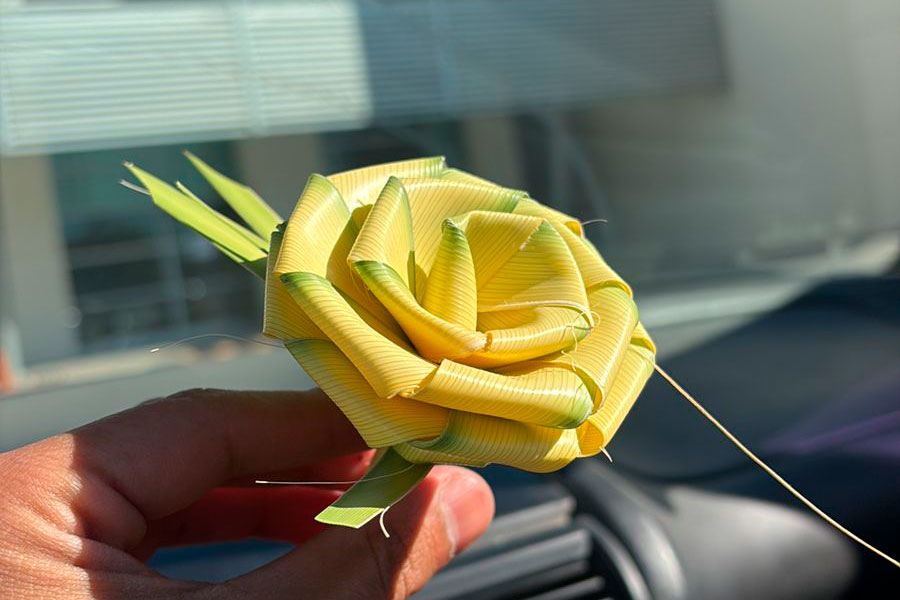 Con 12 años de experiencia, Marcelino aprendió este arte al observar y ayudar a un conocido en su ciudad natal. En solo un mes, ya sabía crear figuras básicas, y con el tiempo perfeccionó su habilidad. Hoy en día, domina a la perfección la técnica, elaborando flores, collares con cruces, colibríes, sombreros, tortilleros, palomas y muchas figuras más, todo exclusivamente con hojas de palma.