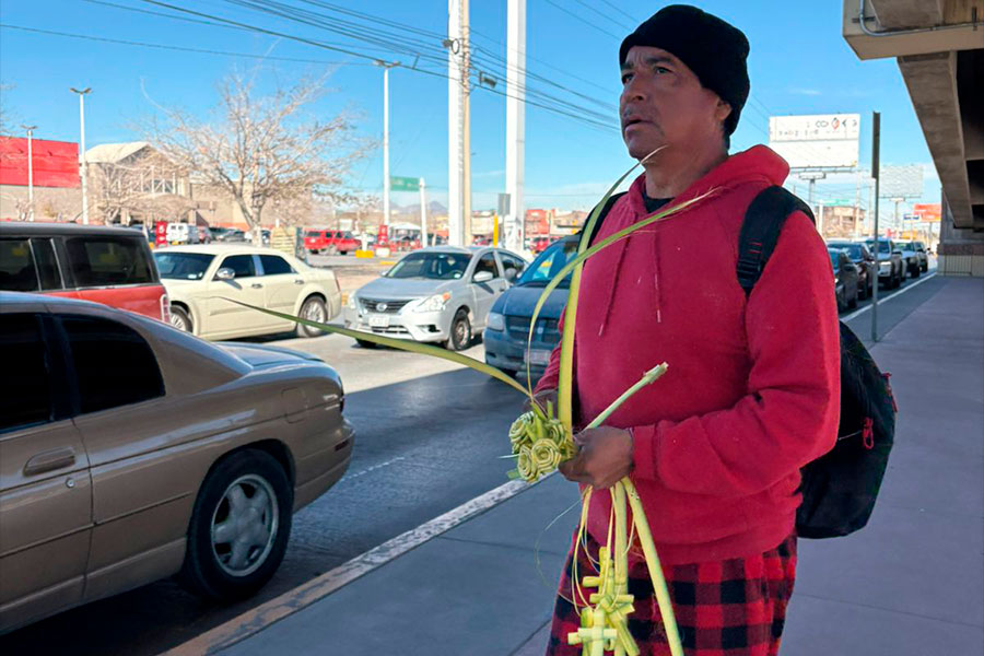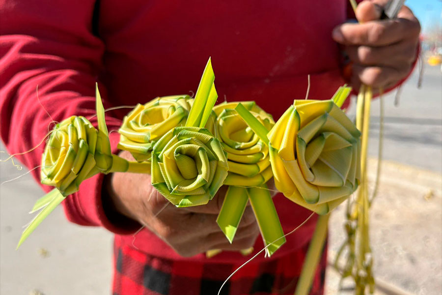 En el cruce de Avenida de las Torres y Boulevard Zaragoza, Marcelino López, originario de Guadalajara, encuentra su lugar en Ciudad Juárez. Hace cuatro años llegó a la frontera, y se trajo consigo un talento único: la artesanía con hojas de palmera.