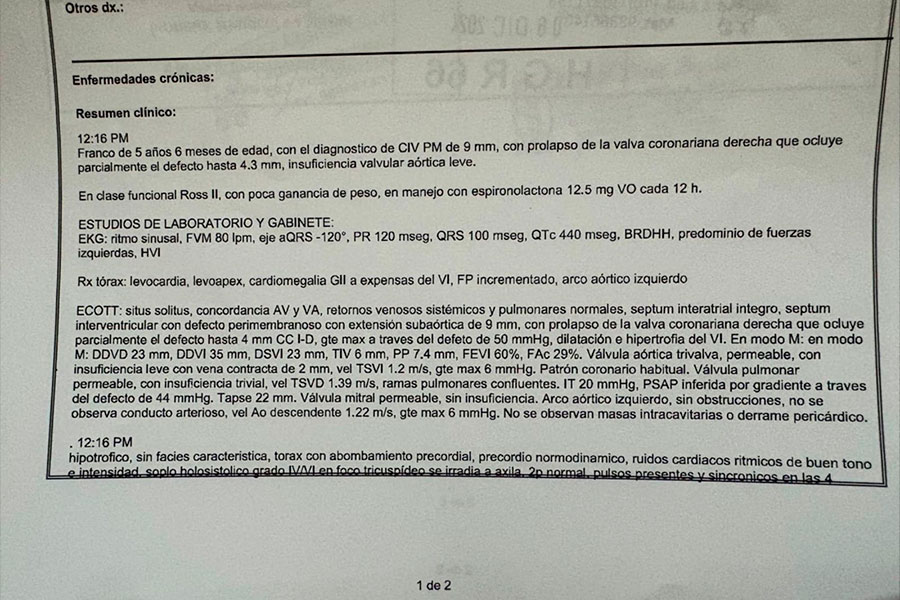 Franco es un niño alegre y lleno de ocurrencias, a sus tan solo 5 años de edad. Nació con un problema cardíaco, un soplo en el corazón, que impide que su corazón funcione correctamente. Franco tiene un “hueco” en una de las paredes que dividen el corazón, lo que provoca que la sangre no circule adecuadamente hacia donde debería.
