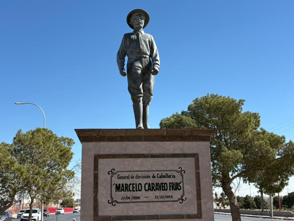 En honor al general Marcelo Caraveo, destacado militar de la Revolución Mexicana y gobernador del estado de Chihuahua en 1928, se erige una imponente escultura en la intersección de Avenida Heroico Colegio Militar y Avenida Plutarco Elías Calles.