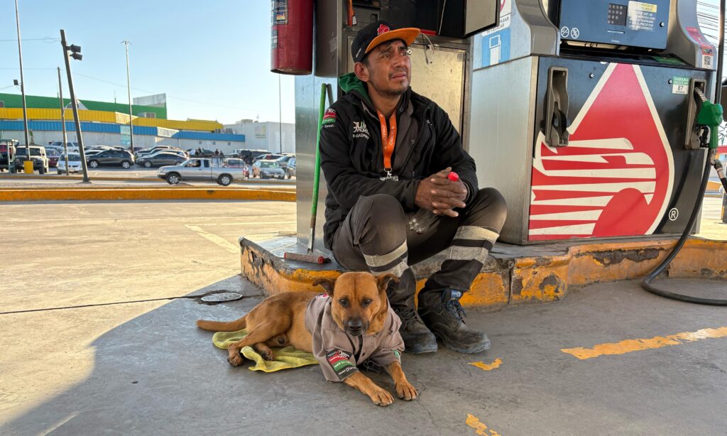 Ahora, con su camisa de la gasolinera se sienta junto a los despachadores durante todo el turno, camina para un lado, camina para el otro, le da vuelta a los autos, se vuelve a sentar y así, hasta que termina su jornada laborar y se va a descansar en el cuarto de vigilancia.