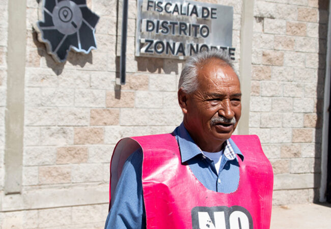 Vestido con una camisa azul, pantalón café y el icónico chaleco rosa con el rostro de su niña, José Luis Castillo se presentó a las instalaciones de la Fiscalía General del Estado (FGE) para entregar un escrito a las autoridades.