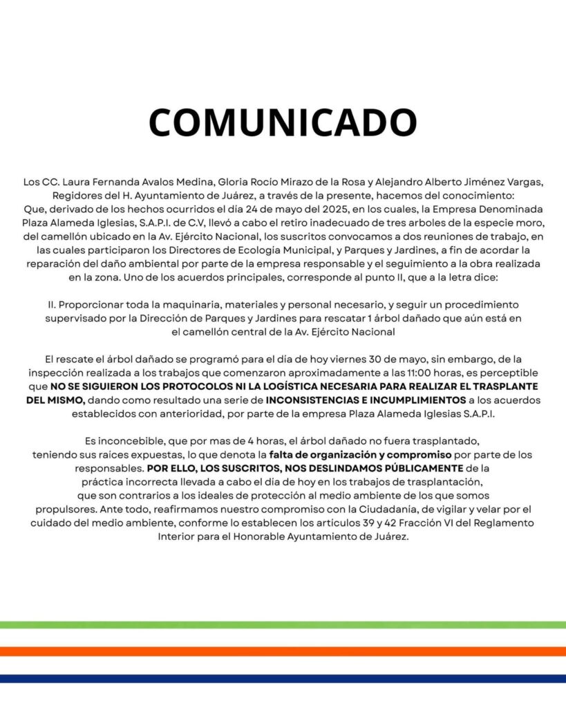 Mediante un comunicado difundido en redes sociales, la regidora Fernanda Ávalos Medina, coordinadora de la Comisión de Ecología, junto a sus homólogos Gloria Rocío Mirazo de la Rosa y Alejandro Alberto Jiménez Vargas, informaron que este viernes se intentó rescatar un árbol que aún permanecía en el camellón, sin embargo, la empresa Plaza Alameda Iglesias S.A.P.I. de C.V. incumplió los acuerdos pactados previamente con las autoridades municipales.