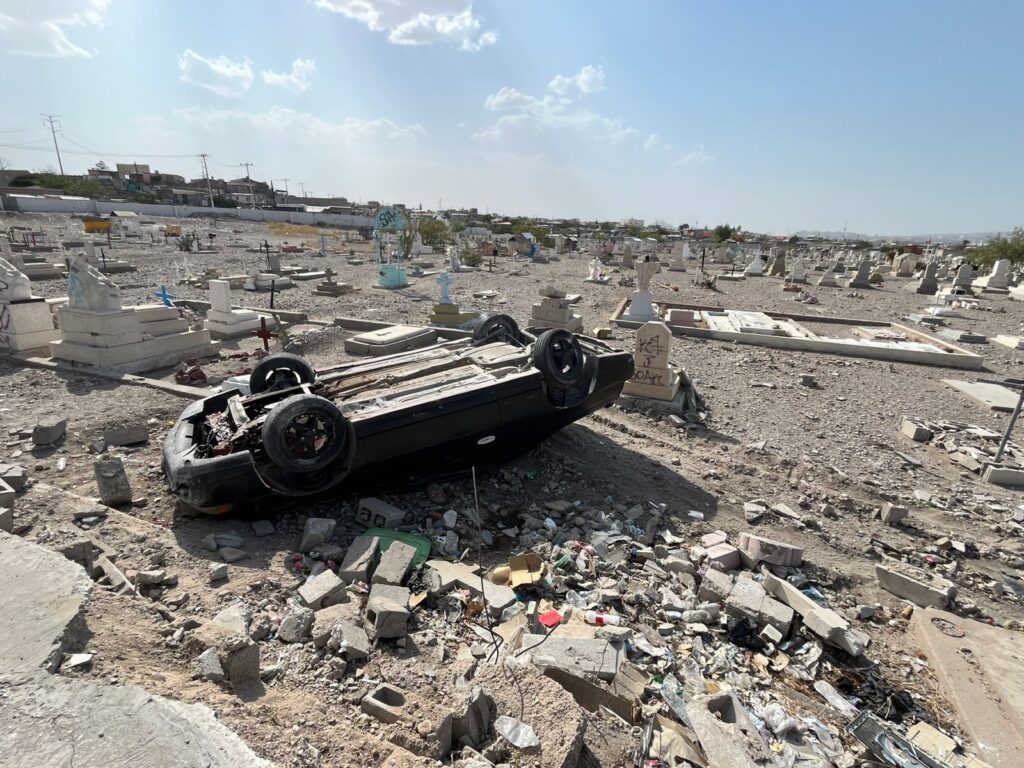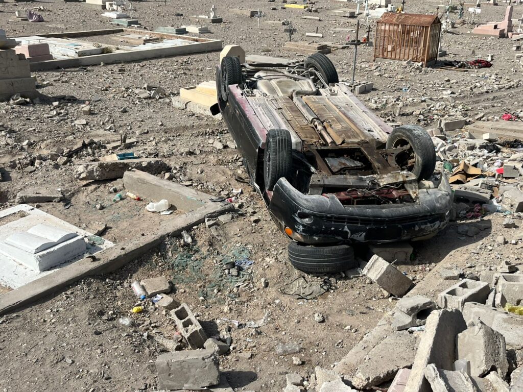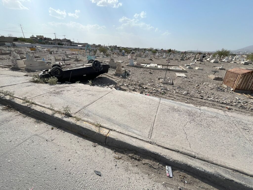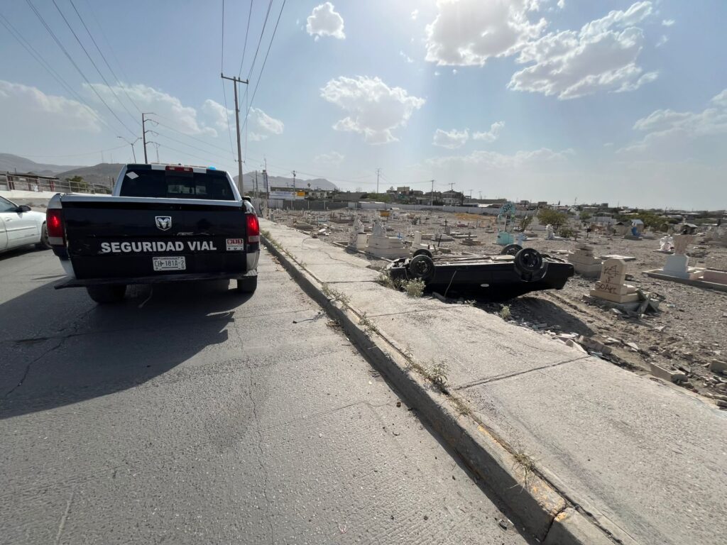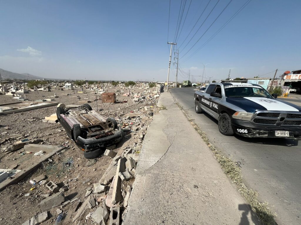 El accidente ocurrió cuando el conductor de un Chevrolet Montecarlo perdió el control al tomar una curva a exceso de velocidad, lo que lo llevó a derribar parte del muro perimetral y quedar volcado dentro del camposanto.
