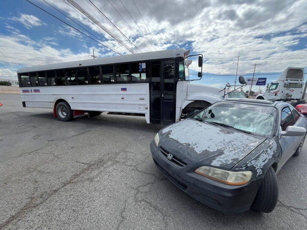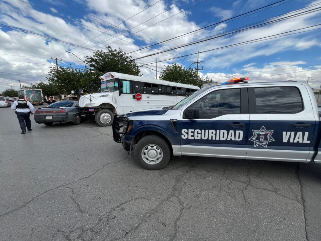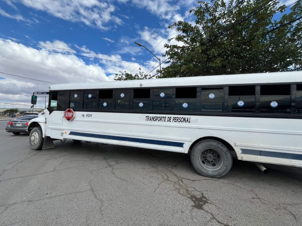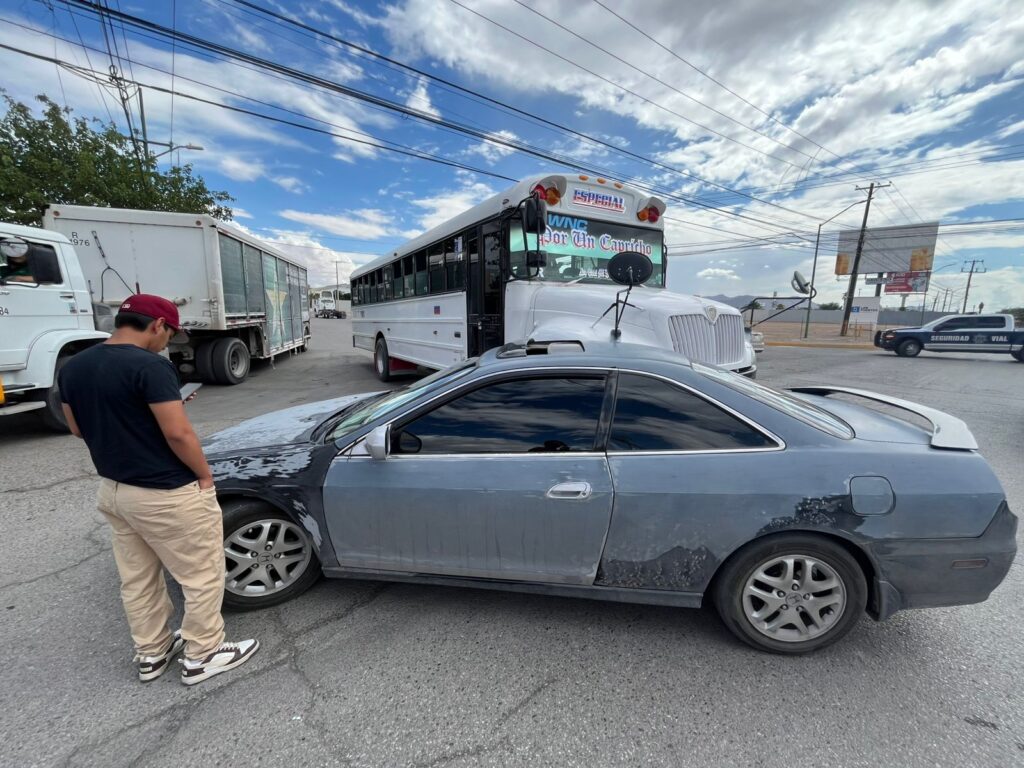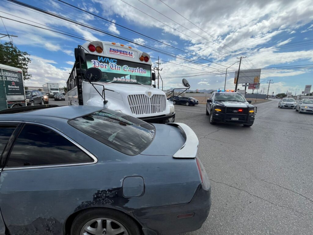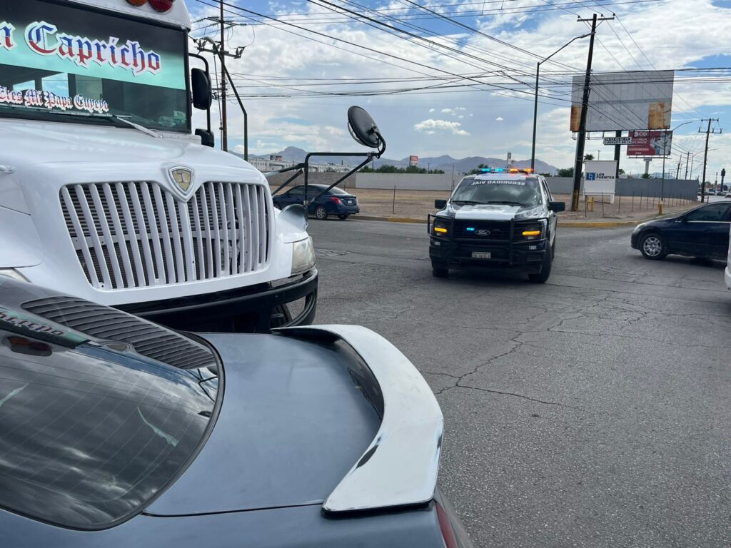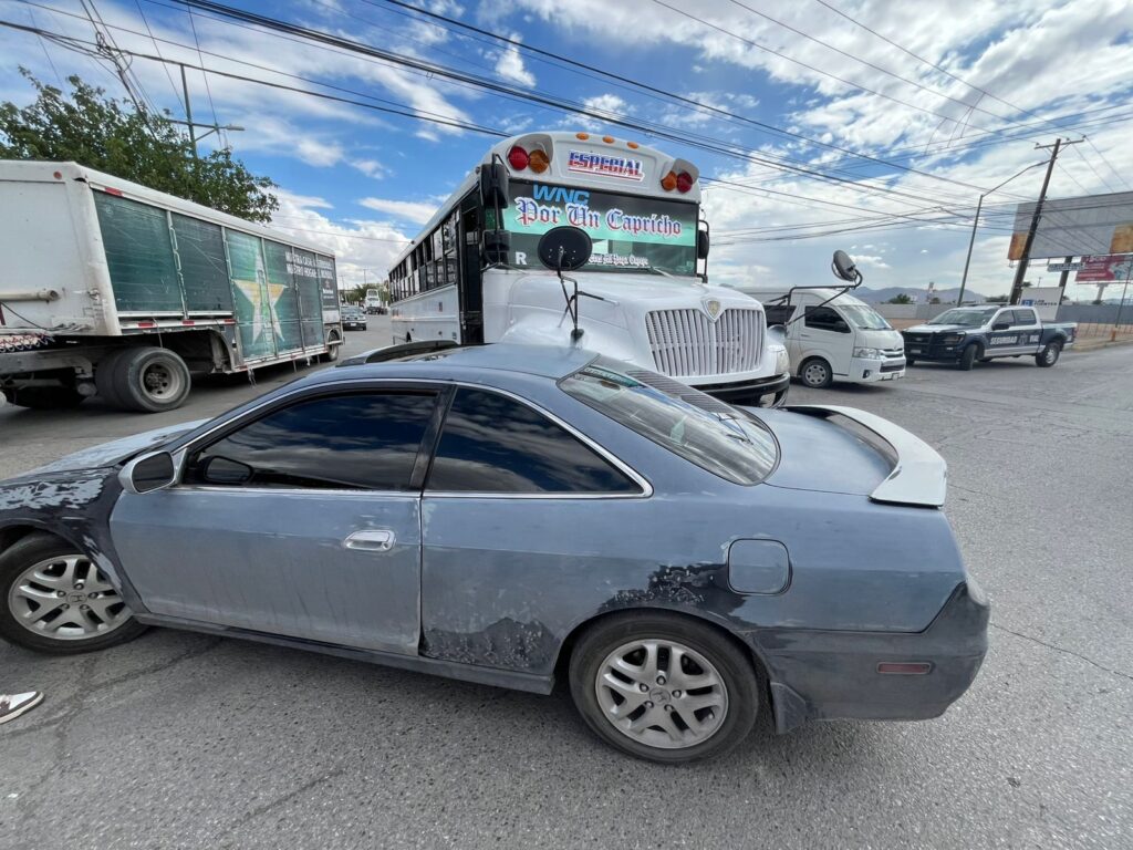 Un camión de transporte de personal, al intentar incorporarse con prisa a la avenida Vicente Guerrero, impactó a un auto compacto Honda Accord color gris, con placas del estado de Chihuahua.