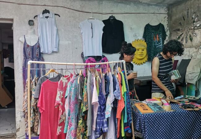 Entre las artistas y artesanas invitadas se encuentran Ofelia del viento, quien realiza bordados y Trapitos Reciclados con su bisutería textil por la artista Rocío Palafox