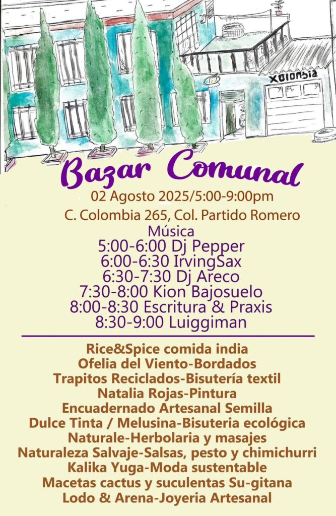 Xolombia: Espacio Cultural Fronterizo invita a la comunidad a asistir a su primer bazar comunitario que se basa en la economía solidaria este sábado 2 de agosto en un horario de 5:00 a 9:00 PM en la calle Colombia 255 Sur, colonia Partido Romero. Los asistentes podrán compartir, crear, intercambiar y fortalecer la economía por medio de la cooperación, el arte y el apoyo.