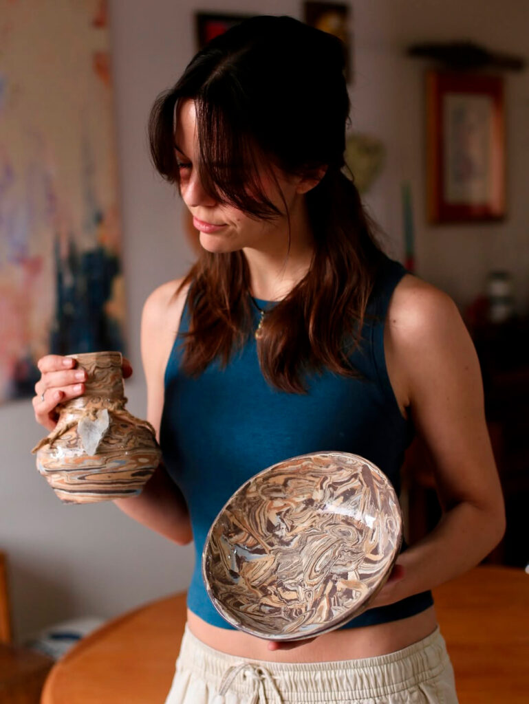 Fue entonces, gracias a la invitación de su amiga a un taller de cerámica impartido por el profesor Israel Gómez Mares, comenzó a explorar todo este mundo, a mantenerse en una sintonía de curiosidad, ir al cerro en busca de tierras para la elaboración de arcilla. “Yo iba ahí al taller, claro que aprendí muchas cosas en YouTube, pero le decía esta la traje de aquí, esta de allá, por lo que experimentamos con estos materiales, esto me ayudó a mí a acoplarme y encontrar algo que me apasionara”.