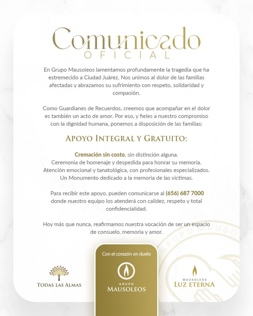 Tras la indignante revelación sobre el crematorio Plenitud, donde fueron encontrados 383 cuerpos apilados en malas condiciones, Grupo Mausoleos emitió un comunicado oficial a través de sus redes sociales expresando su solidaridad con las familias afectadas y anunció una serie de servicios gratuitos como muestra de apoyo y respeto hacia las víctimas.