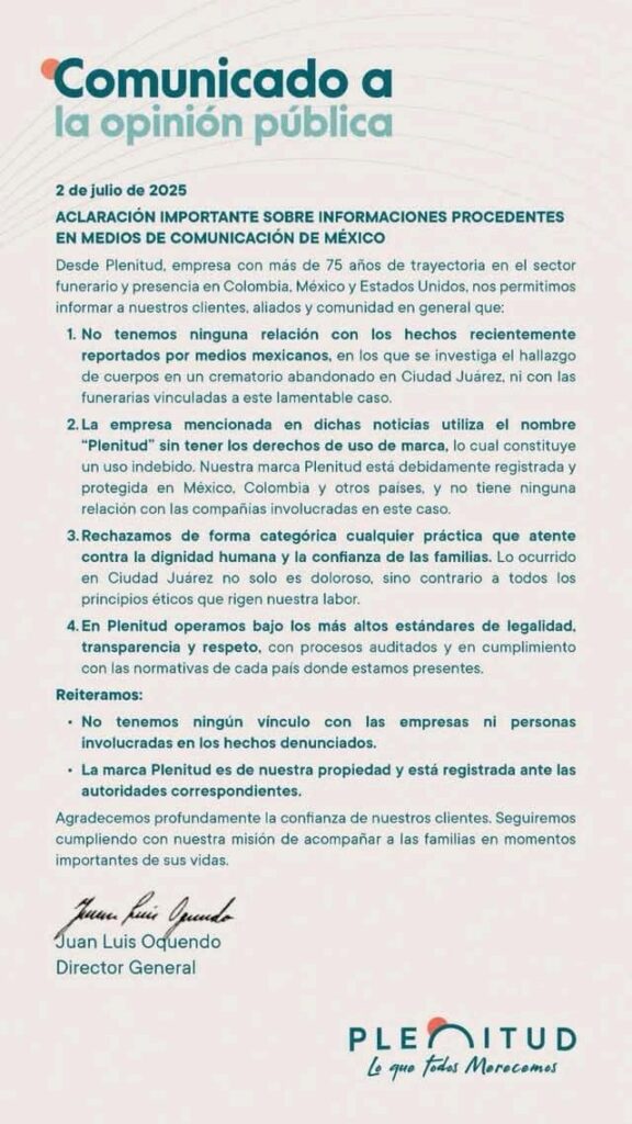 La empresa de servicios funerarios Plenitud, con presencia internacional, emitió un comunicado ayer a través de sus redes sociales y página web de México para deslindarse completamente de los recientes hallazgos de 383 cuerpos apilados en un crematorio en Ciudad Juárez.