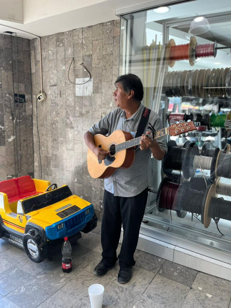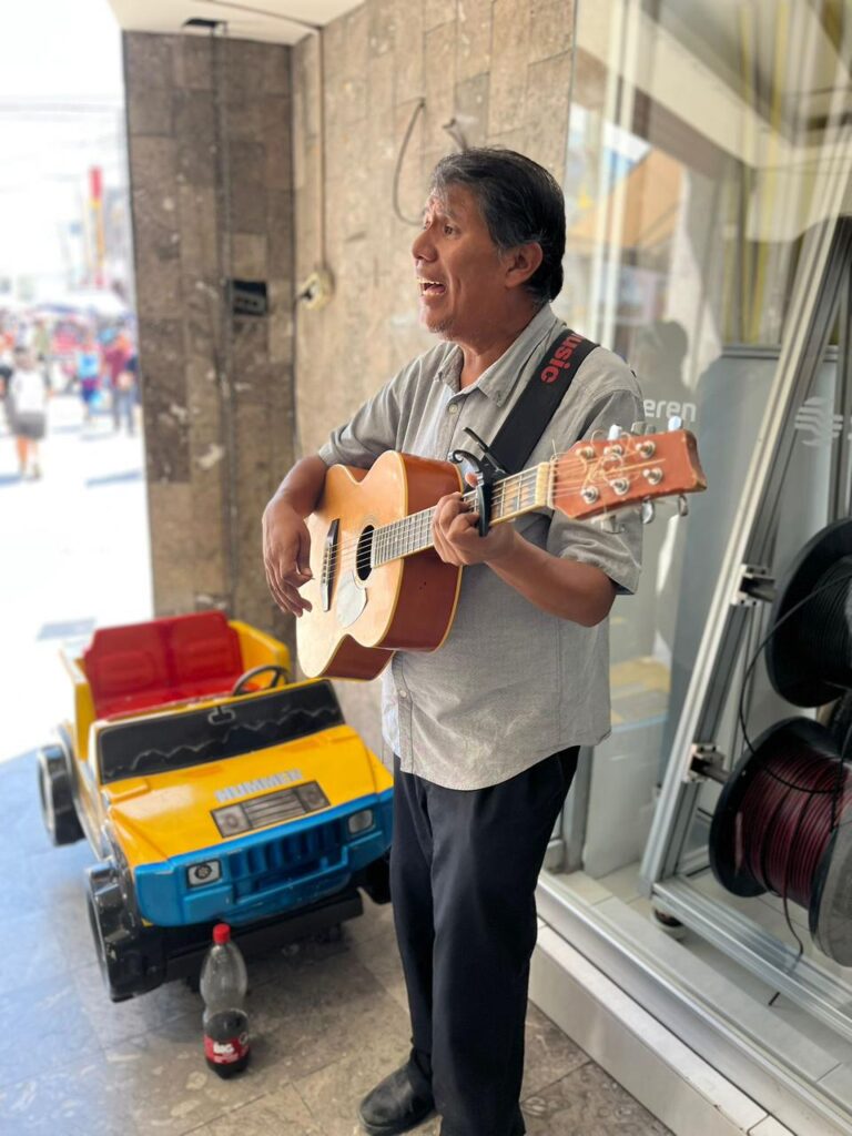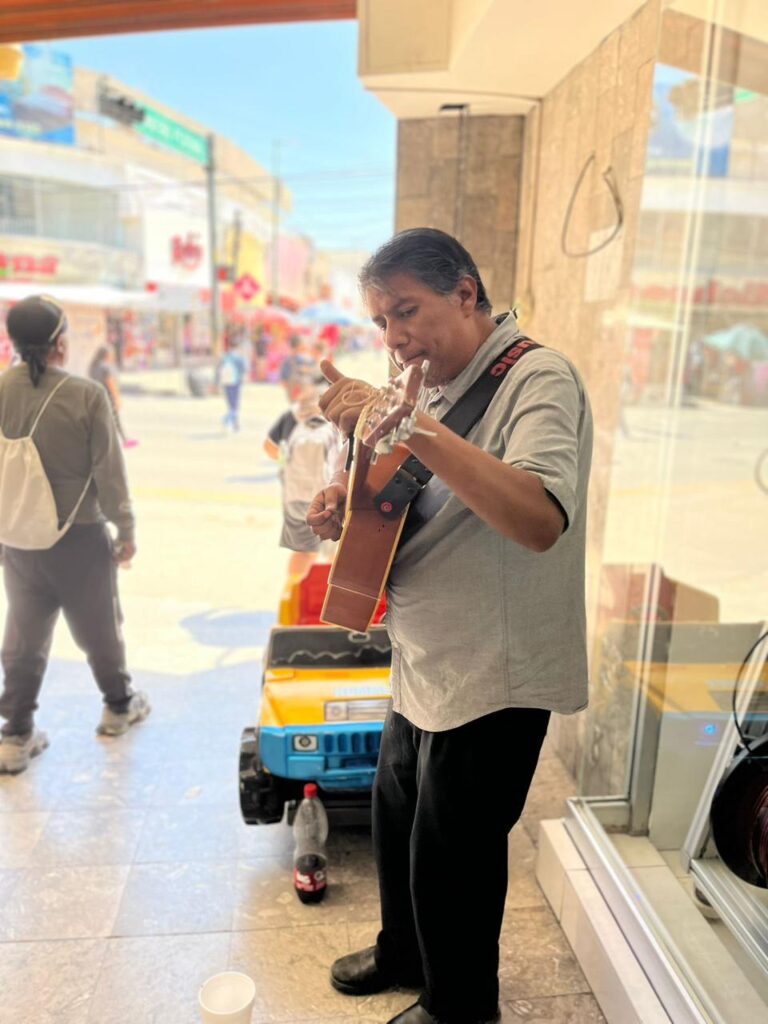 Desde interpretar covers de Los Bukis, Los Yonics, y Los Temerarios, de lunes a jueves ameniza el paso de cientos de juarenses que pasan por el centro. “Es un privilegio porque la música no sé como se me dio, pero por herencia yo empecé a distinguir sonidos”, señala.