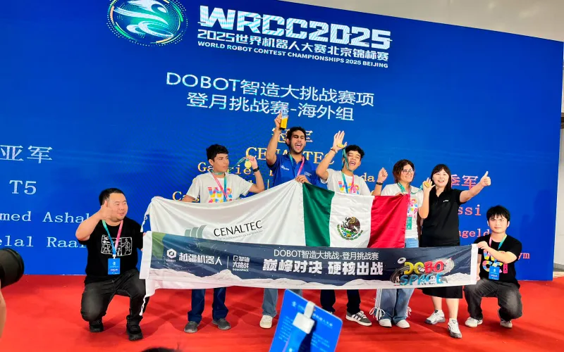 El equipo, conformado por estudiantes del CECyTECH Plantel 20 y del CBTis 122, es Campeón Mundial en el reto “DOBOT Intelligent Manufacturing Challenge-Moon Landing Challenge”, celebrado en el World Robotics Conference 2025 (WRCC) en Beijing, China.