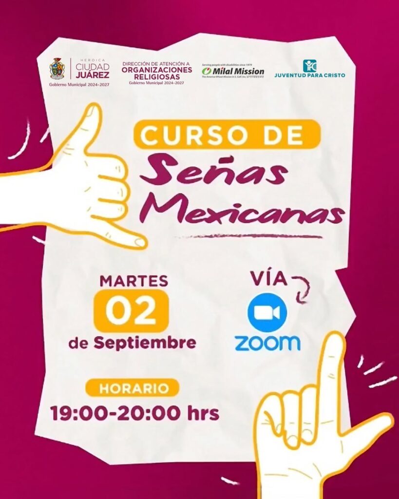 El gobierno municipal y la Dirección de Atención a Organizaciones Religiosas invita a la comunidad a un curso de lengua de señas gratuito en modalidad virtual que empezará el próximo 2 de septiembre por medio de Zoom de 7:00 a 8:00 PM.
