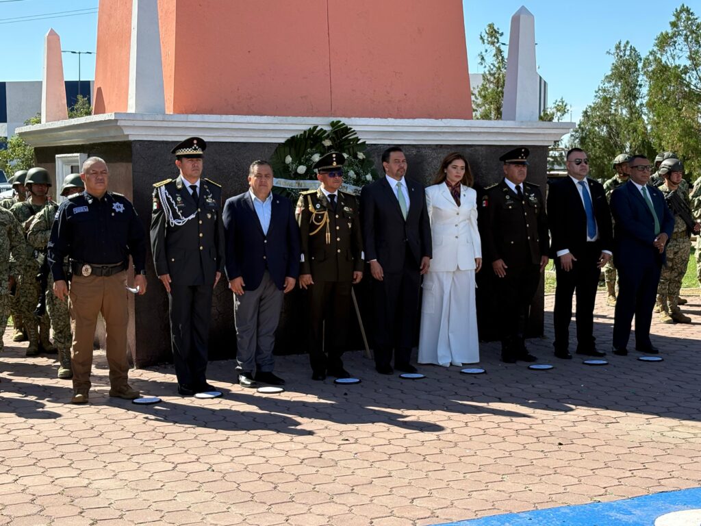 El evento lo encabezó el presidente municipal Cruz Pérez Cuéllar y el general brigadier José Salud Lemus Cisneros, comandante de la Guarnición Militar de la Plaza, quienes también realizaron una guardia de honor.