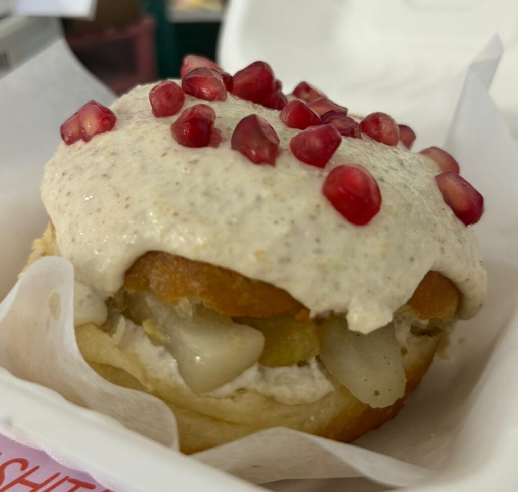 Es por eso que creó la berlinesa y el pastel en nogada. La berlinesa que prepara está rellena de nogada, manzana, pera y plátano macho salteado en mantequilla, bañada en nogada y decorada con granada, mientras que al pastel le agrega tres leches y betún de nogada.