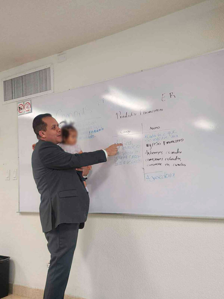 El día de ayer, una alumna del Instituto de Ciencias Sociales y Administrativas (ICSA) de la UACJ, Paulina Mier, compartió en redes una foto del profesor Abdul Oronoz dando clase mientras cargaba a una niña. La imagen no tardó en llamar la atención de la comunidad universitaria.
