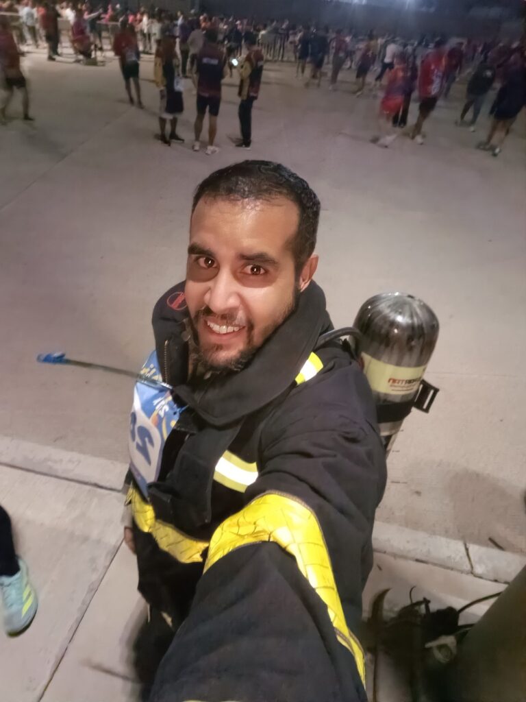 Portando un traje de bombero de 9 kilos y un tanque de aire de más de 4 kilos, Jorge completó la ruta con determinación. Además, después de correr el maratón, Jorge apoyó en el área médica.