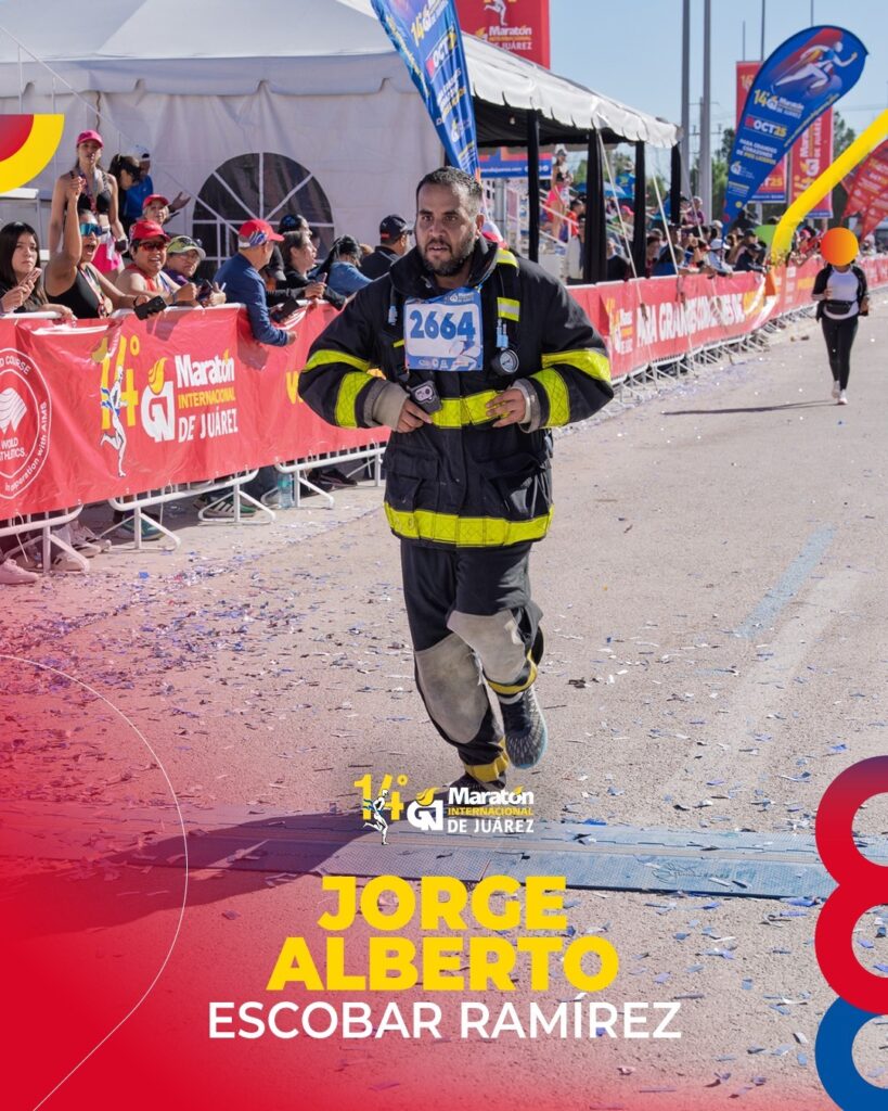 Jorge Alberto Escobar Ramírez corrió el Maratón Internacional de Juárez de una forma muy simbólica: en honor a los bomberos, paramédicos y rescatistas que no tienen la opción de rendirse.