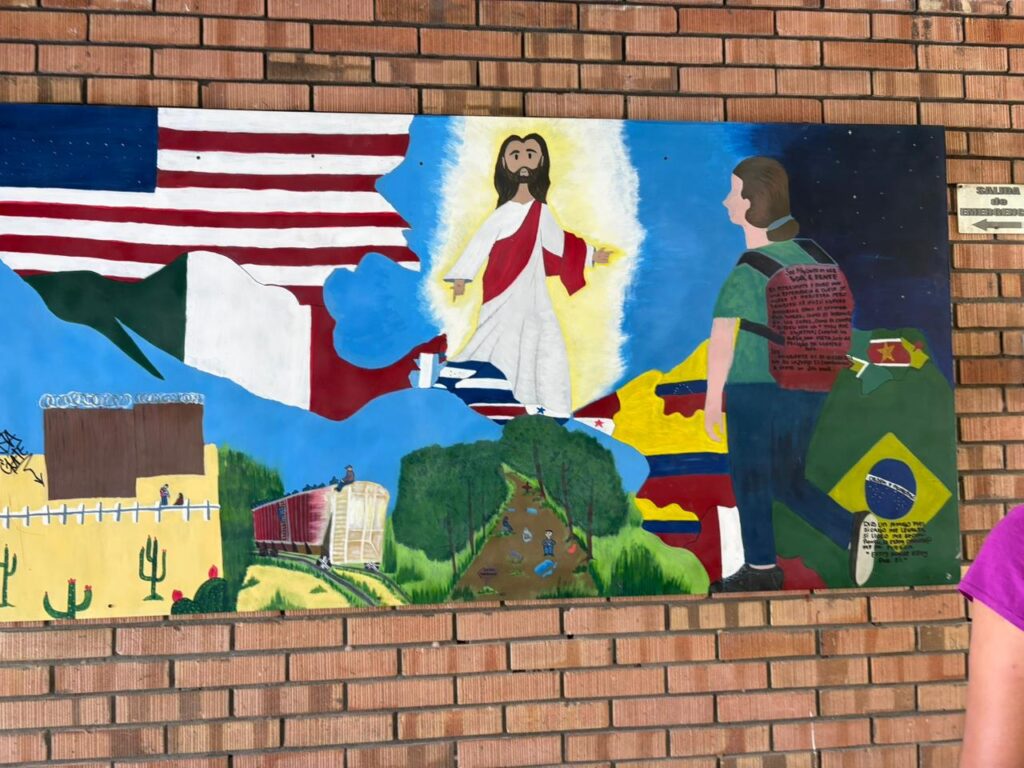 Krista realizó una pintura de gran tamaño que le tomó cinco meses terminar, plasmando la historia de muchas personas que, como ella llegan a la frontera para cruzar