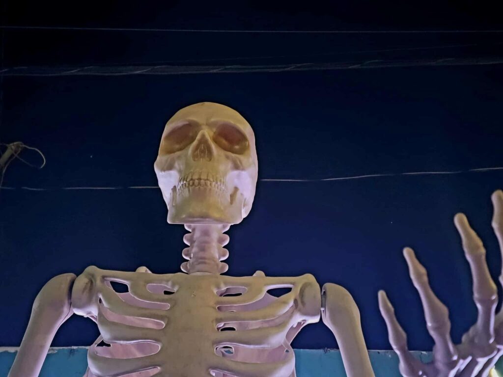 La casa sorprende con una decoración completamente renovada con un esqueleto con movimiento de tres metros de altura, cuyas manos se mueven y atraen todas las miradas.