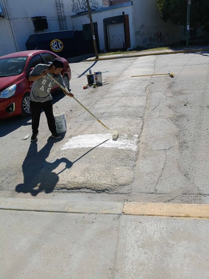Un padre de familia terminó de pintar los señalamientos que inició para reforzar la seguridad en calles cercanas a un kínder