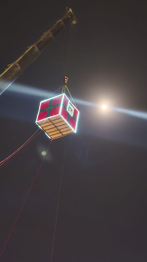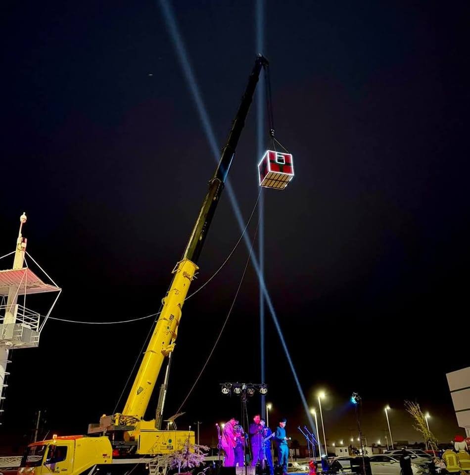 Del 11 al 14 de diciembre, ambos permanecerán suspendidos en esta caja colgante a 40 metros de altura, animando e invitando a la comunidad a sumarse a la colecta para que ningún niño en Juárez se quede sin juguete esta navidad.
