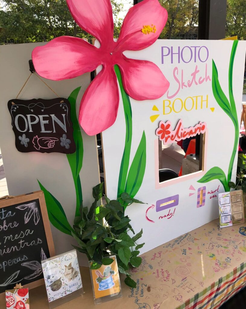 Dentro de la caja que simula una cabina de fotos, se les pide a las personas realizar tres poses distintas durante algunos segundos para dibujar sus siluetas. Mientras Jimena los retrata, el público puede crear sus propios dibujos con gis, pintura o crayones, convirtiéndolo en una experiencia profundamente creativa para ellos también.