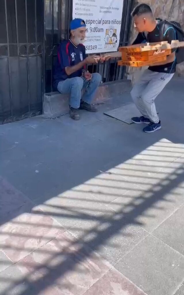 Entre sonrisas y sus ganas de ayudar, fue entregando rebanadas de pizza, lonches y bebidas a todos los que se encontraban en diversas partes del centro, sin importar quienes fueran.