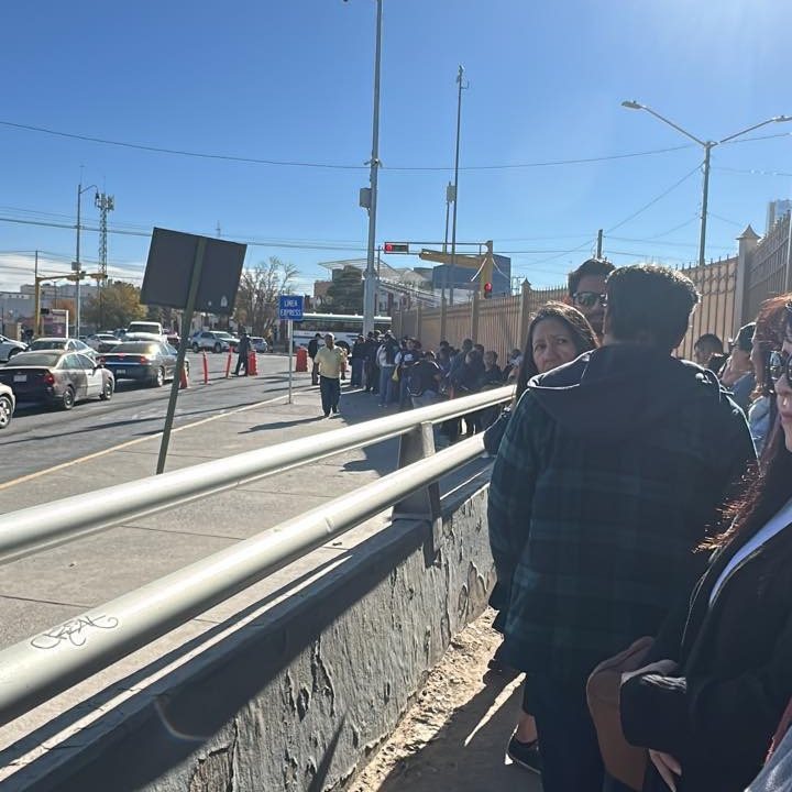 En el puente internacional Paso del Norte se puede observar una fila que le da la vuelta a la calle Gardenias, usuarios han reportado varias horas de espera para poder cruzar.