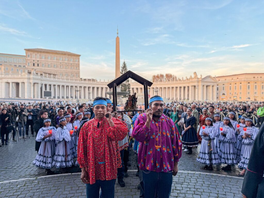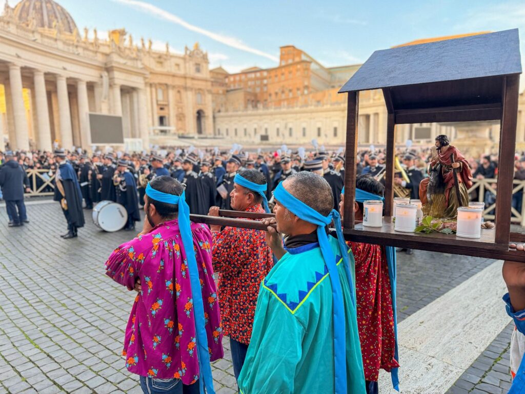 Este lunes la Sierra Tarahumara llevó hasta Roma, en la Plaza de San Pedro, un nacimiento rarámuri tallado por artesanos de Chihuahua, por su participación en la exposición internacional “Cien Pesebres”.
