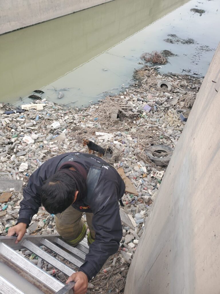 Los elementos de la dependencia usaron una escalera y soga para sacar al perrito del canal.