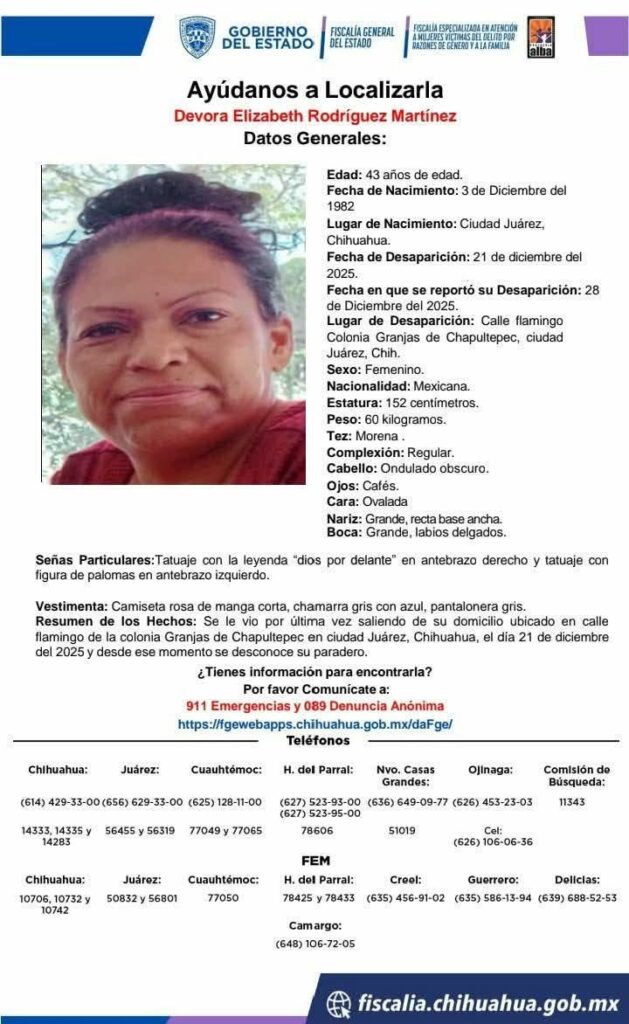 Deborah fue vista por última vez el 21 de diciembre en la colonia Granjas de Chapultepec, y fueron sus familiares quienes realizaron el reporte de ausencia el pasado 28 de diciembre de 2025.