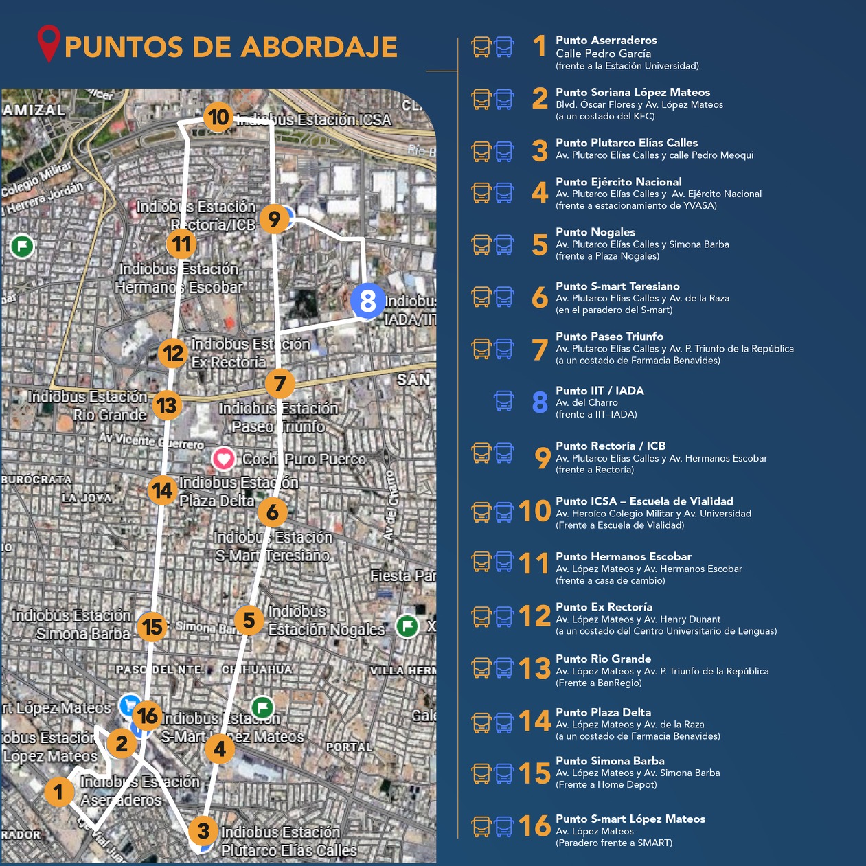 El Circuito Universitario abarcará avenidas principales como Plutarco Elías Calles, López Mateos, Eje Vial Juan Gabriel, blvd. Óscar Flores, avenida Ejército Nacional, calle Simona Barba, avenida de la Raza, Paseo Triunfo de la República y avenida Hermanos Escobar.