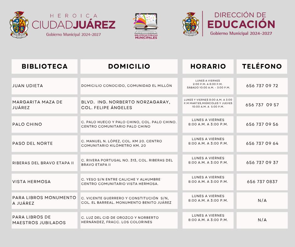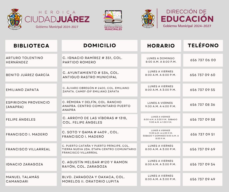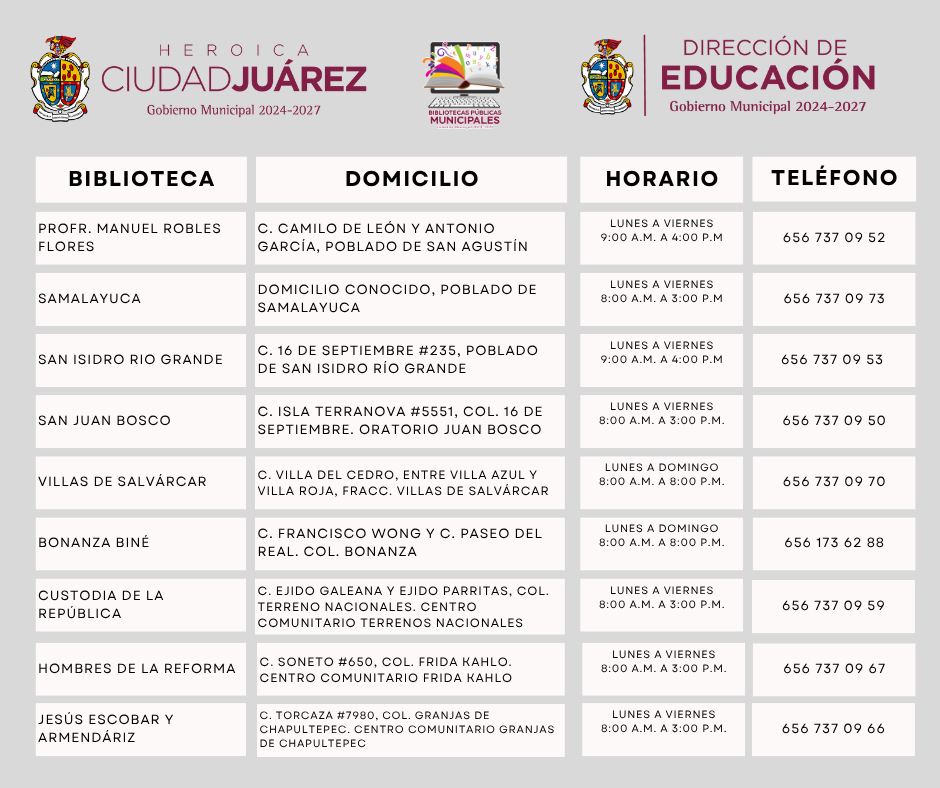 A través de la Dirección de Educación de Ciudad Juárez, dirigida por el Prof. Guillermo Alvidrez, invitan a la comunidad a tramitar su credencial de la biblioteca, la cual da entrada a muchos títulos de diferentes géneros, así como préstamo de libros para todas las edades y el uso de espacios cómodos para leer, estudiar o investigar.