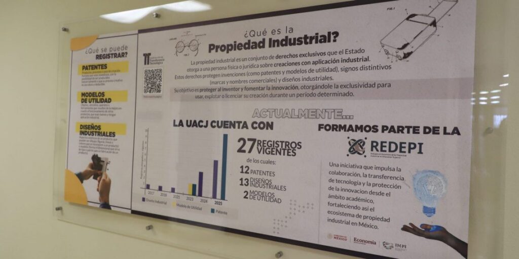 La exposición parte de la campaña de Propiedad Industrial de la UACJ, consta de 11 acrílicos en los que se muestran 27 proyectos desarrollados por profesores y profesoras de la UACJ.