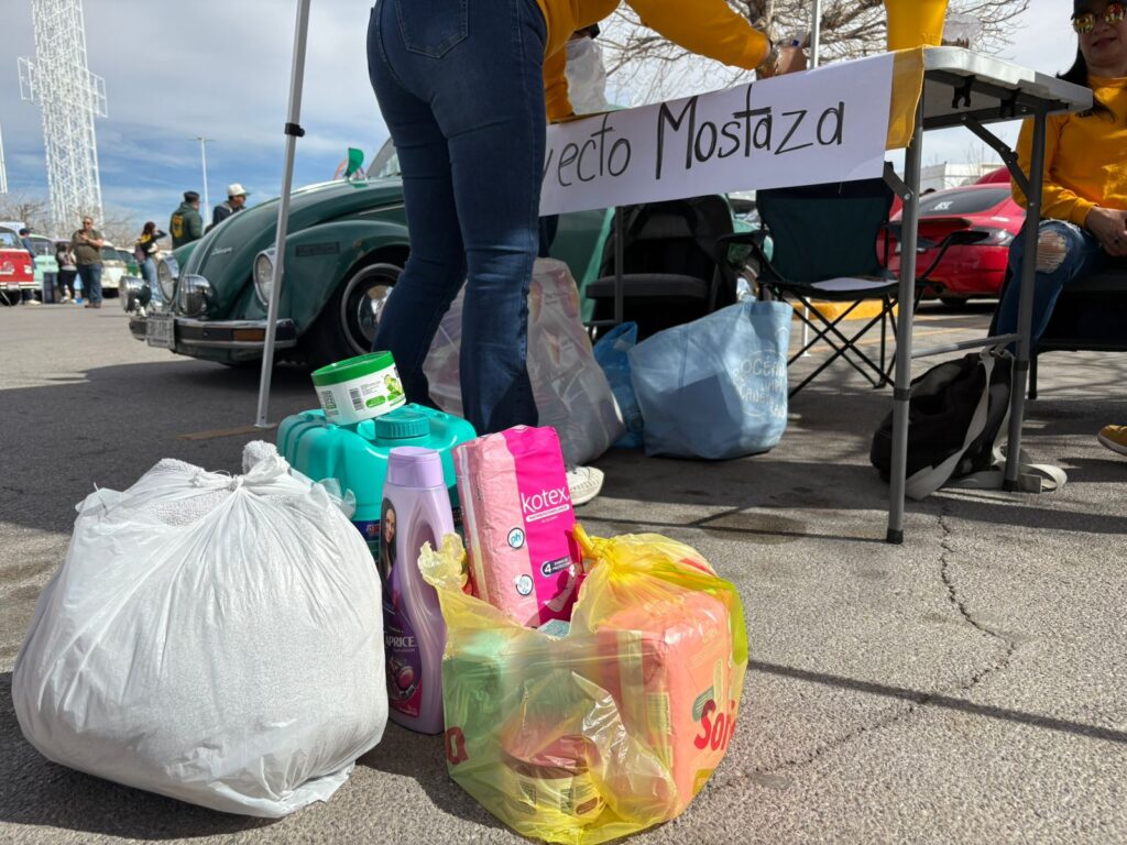 Maribel Vega, representante de la comunidad Volkswagen de Ciudad Juárez, invita a toda la comunidad a donar artículos de aseo personal, como rastrillos, toallas sanitarias, papel higiénico y crema, así como productos de limpieza, entre ellos cloro y jabón.