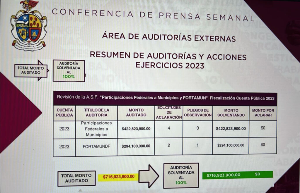 En cuanto a la cuenta pública 2023, detalló que inicialmente se emitieron nueve observaciones y siete solicitudes de aclaración por un monto de 716 millones de pesos.