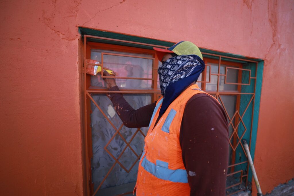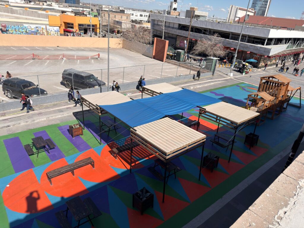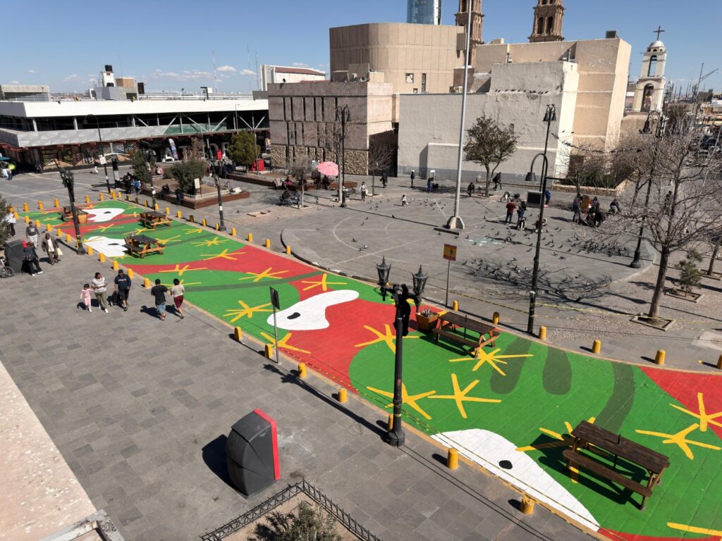 El día de ayer se concluyó la intervención en las zonas de “Senderos del Desierto” y “Plaza Lápiz”, en los cuales se hicieron trabajos como ampliación de banquetas con arte en asfalto, creación de cruces peatonales seguros, así como una esquina recreativa con bancos, mesas y un espacio para que los niños puedan jugar.