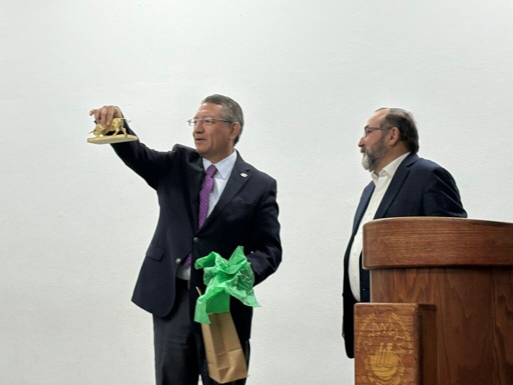 Al final de la ponencia, el Doctor Óscar Ibáñez, rector de la universidad, elogió el trabajo del Doctor Mora y le dio un presente muy significativo elaborado por la comunidad estudiantil: un reconocimiento y un toro dorado impreso en 3D que simboliza la mascota representativa de la UTCJ.