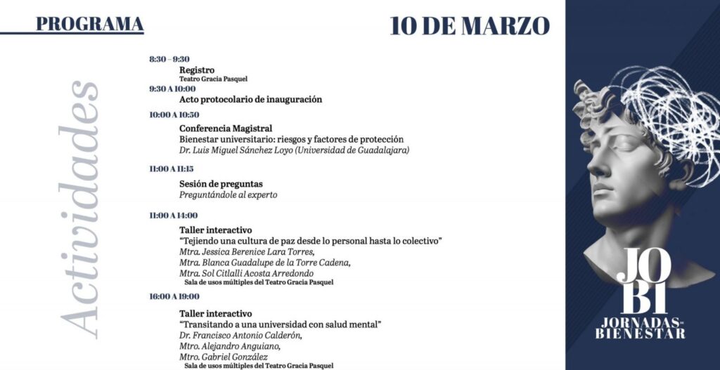 La Dirección General de Bienestar Universitario invita a la comunidad estudiantil a participar en las Jornadas de Bienestar, que se llevarán a cabo los días 10 y 11 de marzo, con el objetivo de fortalecer la salud mental, promover la cultura de paz y difundir los servicios que ofrece la universidad.