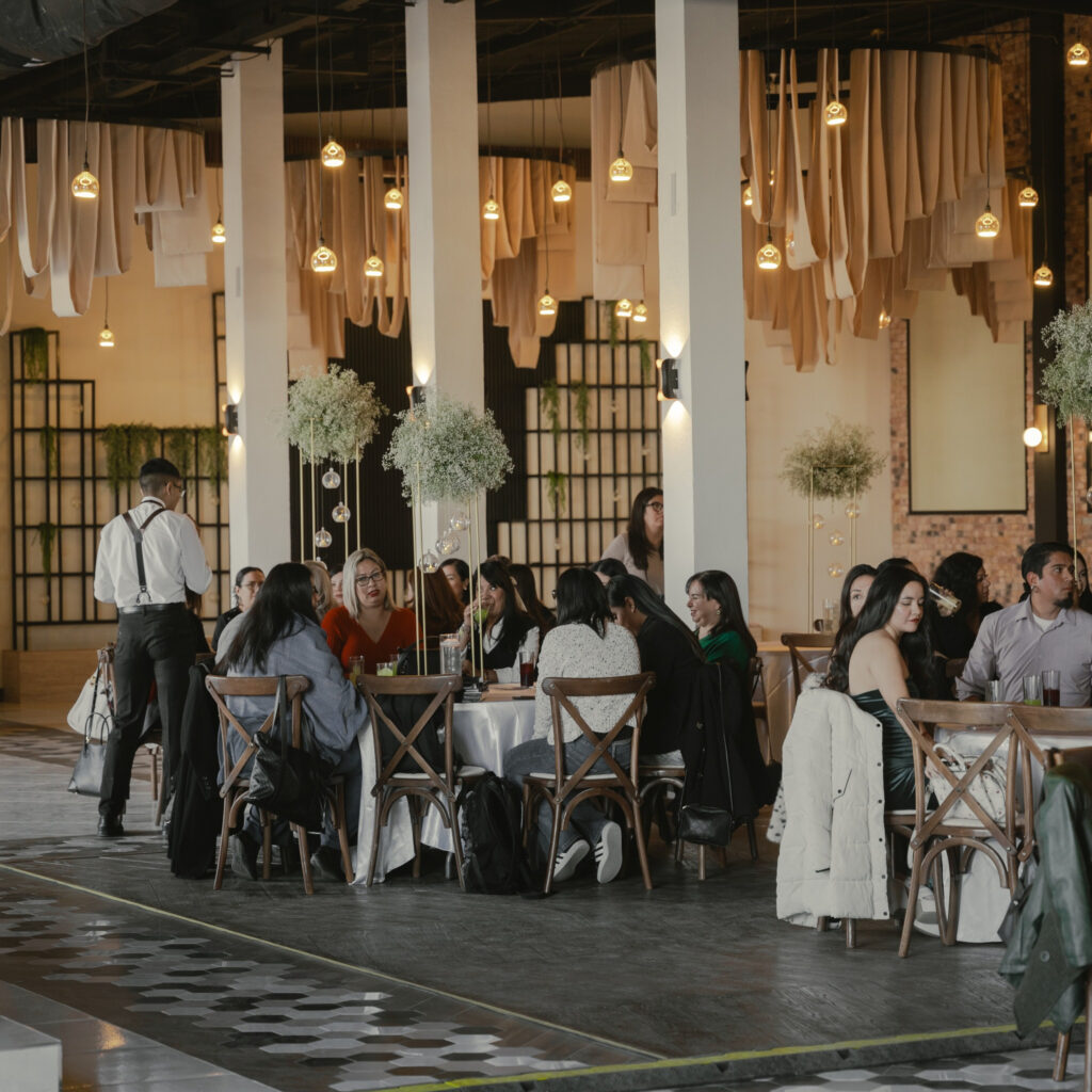 La iluminación colgante, con tonalidades cálidas, crea una atmósfera acogedora que envuelve a los asistentes, haciéndolos sentir como en casa mientras disfrutan de exclusivos paquetes que incluyen banquetes gourmet cuidadosamente preparados.