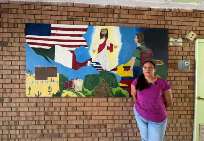 Krista realizó una pintura de gran tamaño que le tomó cinco meses terminar, plasmando la historia de muchas personas que, como ella llegan a la frontera para cruzar